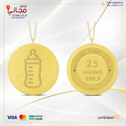 مميزات سبيكة ذهب دائرية 5 جرام مع تعليقة ذهب صافي بأعلى درجات النقاء عيار 24 قيراط ونسبتها ( 999.9 ) الوزن مع التعليقة 5 جرام